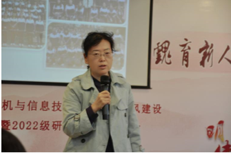 随后,教学副经理兼系主任牛盼盼老师对各位2022级同学们的到来表示了欢迎,并向同学们介绍了计算机科学与技术(师范)专业的发展状况。在对如何上好大学的事情上,牛盼盼老师向同学们提出了“四个不误”,希望同学们在生活中牢记时间观念,在学业与精神上双双发展,并树立远大抱负,创造美好未来。最后,牛盼盼老师向同学们放映了宣传片使同学们更好地了解学院学科专业等方面的发展状况。