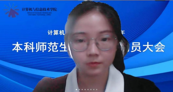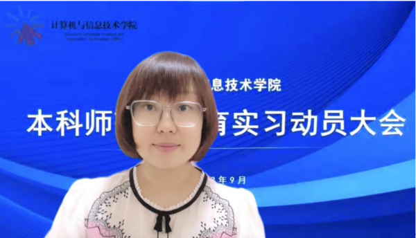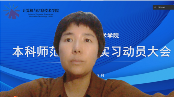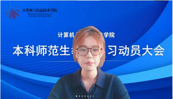 会议第三项,指导教师代表石慧发言。她指明疫情不能阻止计信学子求知求学的步伐,不能阻止计信学子传道授业的信念,因此希望员工们克服困难,认真完成教育实习各项工作,提高自我管理能力,真正做到自律、自觉、自主地完成教育实习,做到说练结合,不断提升专业素养。