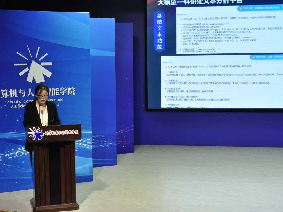 2023级研究生孟佳慧围绕“智己未来——以AI与数据重塑多领域新生态”主题,分享了人工智能在医学、生物等多领域交叉研究的成果,取得了多方面的显著突破,充分彰显了人工智能在跨界融合方面的巨大潜力。
