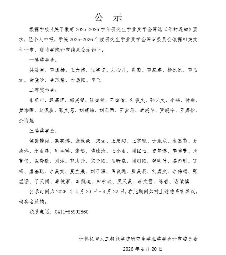 ylzzcom永利总站线路检测 2025-2026学年研究生学业奖学金初评结果公示